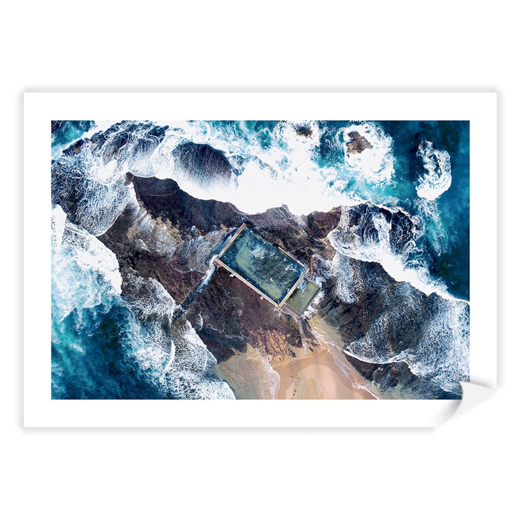This aerial photo was taken above Mona Vale Beach, Sydney NSW. The 30m long Mona Vale rock pool is situated on the tip of a sand spit near the northern end of Mona Vale Beach.