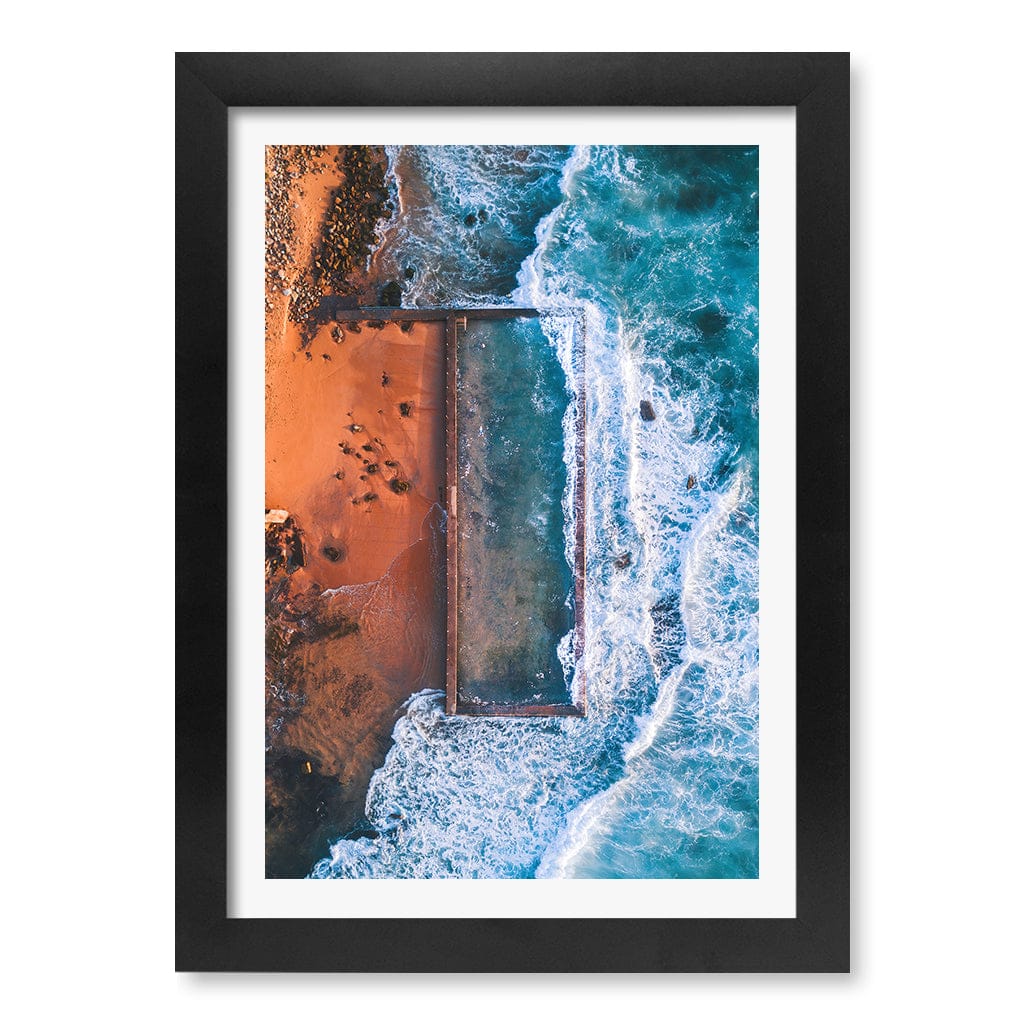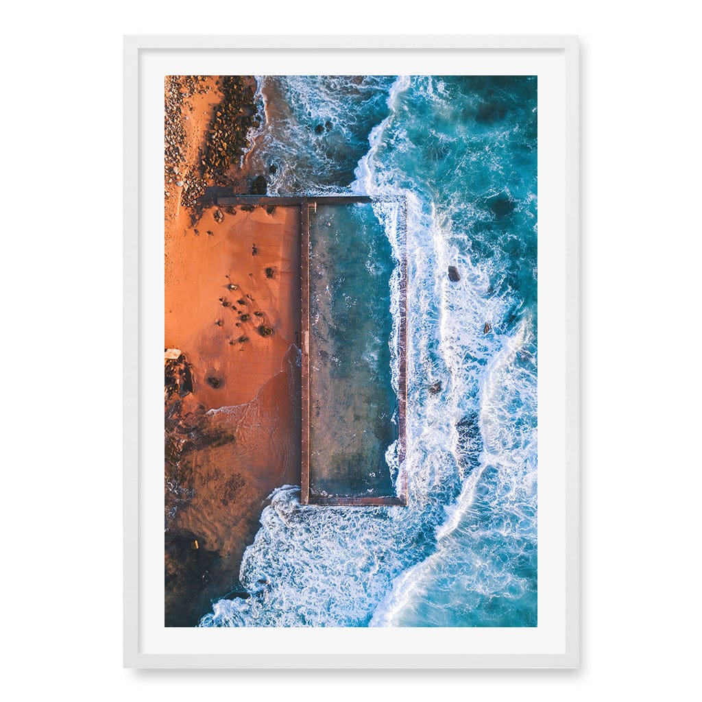 This aerial photo was taken above Newport Beach Rock Pool, Sydney NSW. This unique rockpool is positioned at the southern end of Newport Beach and has a natural rock platform as its floor. Measuring 50 metres long, its Olympic size makes it a favourite place for local swimmers to do laps while surrounded by the sound of the ocean waves.